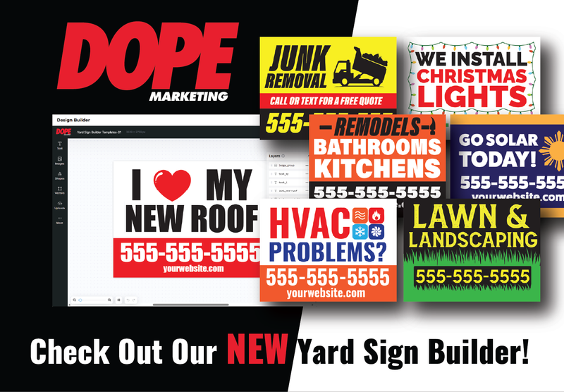 Shop Yard SignsYard signs are the PERFECT way to market your business. Place signs at busy traffic lights, coming out of ideal neighborhoods, in yards of jobs you’ve completed or even in busy shopping areas! DOPE Yard Signs are printed on sturdy 4mm Corrugated Plastic. This material is both sun and weatherproof and will last MONTHS outdoors!
