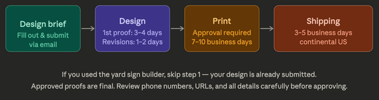 Each order is for ONE DESIGN (BOTH SIDES) PER ORDER (e.g., 100 YARD SIGNS = 100 of the SAME design). To use multiple designs, please place separate orders