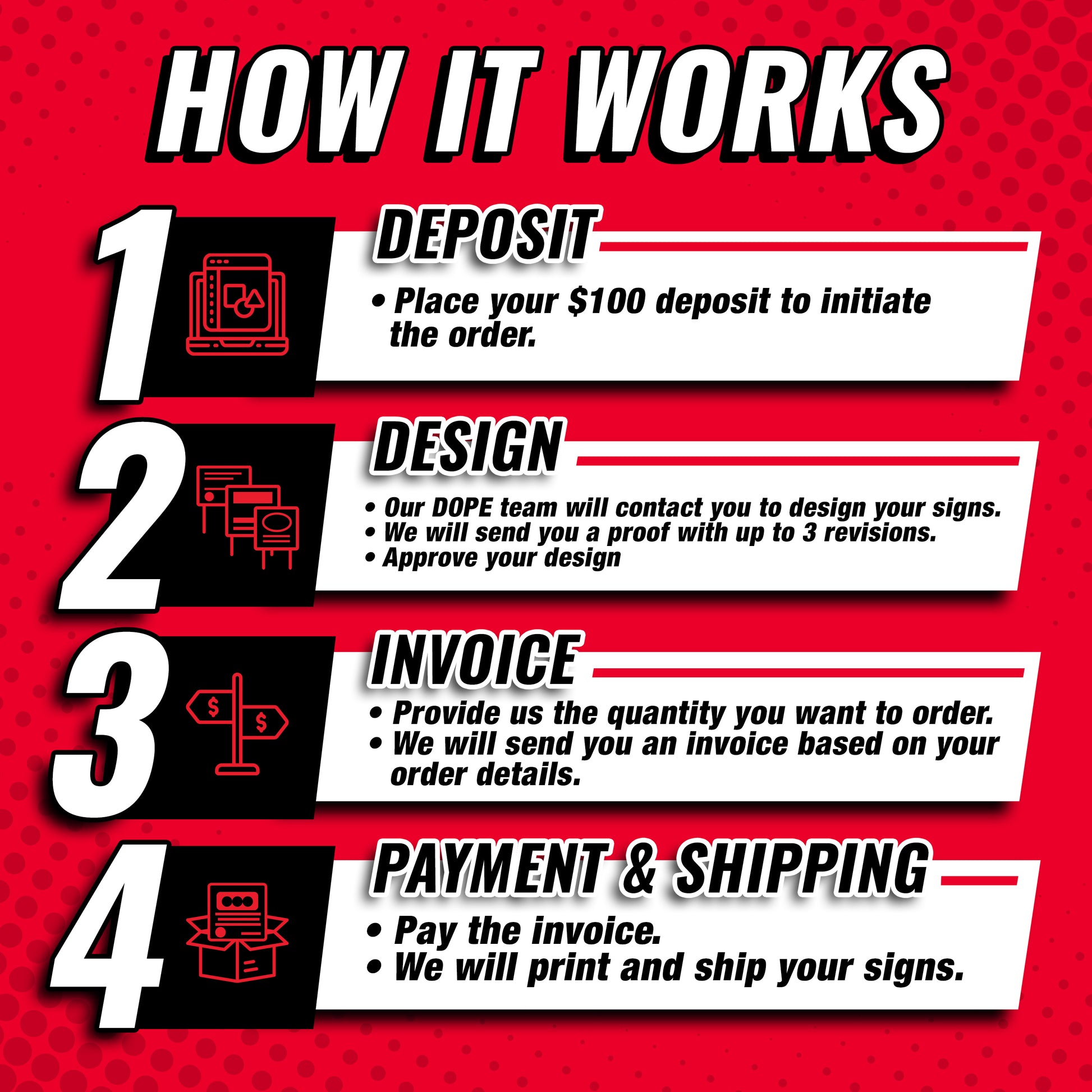 Place a $100 deposit to start, approve your design and quantity, receive and pay the invoice, and we'll print and ship your signs.